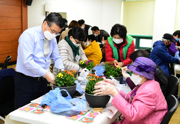 서울 중랑구가 경로의 달을 맞아 최근 신내1동 주민센터에서 어울림 프로그램을 진행했다. 이번 프로그램은 국화 분갈이 체험, 메시지 카드 작성 등 다양한 활동이 진행됐다. 사진은 이날 참여한 류경기 구청장(왼쪽)이 노인들과 국화 분갈이 체험을 하고 있는 모습. (사진제공=중랑구청)