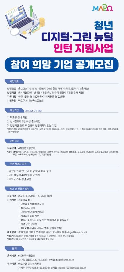 [시민일보 = 홍덕표 기자] 마포구(구청장 유동균)가 지역내 4차 산업분야의 우수한 중소기업을 대상으로 추진하는 '청년 디지털·그린 뉴딜 인턴 지원사업'에 참여할 기업을 22일부터 오는 4월2일까지 모집한다.