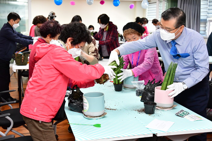 중랑구가 '경로의 달'을 맞아 오는 30일까지 인지향상 퍼즐맞추기 프로그램(면목3·8동), 원예체험 프로그램(묵1동), 풍선아트 프로그램(중화2동), 추억공유 프로그램(면목4동) 등 16개 동별 어울림 프로그램을 진행한다. 사진은 지난 20일 류경기 구청장(오른쪽)이 묵1동에서 진행된 ‘원예체험 프로그램’에 참여한 모습. (사진제공=중랑구청)