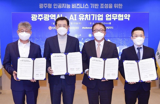 [광주=정찬남 기자] 광주광역시는 25일 오후 시청 비즈니스룸에서 AI 유치기업인 ㈜럭스로보, ㈜로보케어, ㈜얍컴퍼니 등 3개 업체와 광주형 인공지능 비즈니스 기반 조성을 위한 53~55번째 업무협약을 체결했다.