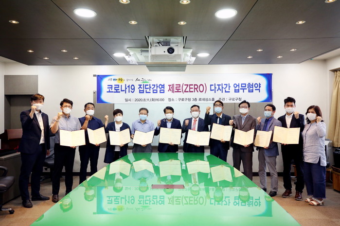 서울 구로구가 11일 지역내 요양병원과 ‘집단감염 발생 제로(ZERO)화’를 위한 업무협약을 체결했다. 이 협약은 감염 취약계층이 많은 요양병원내 코로나19 확산 방지를 위해 마련됐다. 사진은 협약식에서 이성 구청장(왼쪽에서 여섯 번째)과 관계자들이 기념촬영을 하고 있는 모습. (사진제공=구로구청)