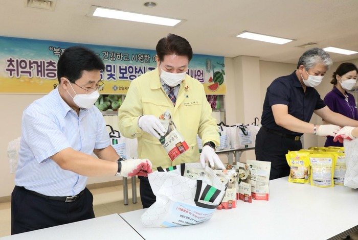 경기 안양시가 최근 시 지역사회보장협의체와 함께 지역내 홀몸노인 등 취약계층 310가구에 여름용품과 보양식 꾸러미를 전달하는 '복지사계절 건강하고 시원한 여름나기' 행사를 개최했다. 사진은 행사에 참여한 최대호 시장(왼쪽 두 번째)과 관계자들이 꾸러미를 포장하는 모습. (사진제공=안양시청)