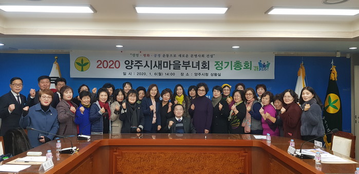 경기 양주시새마을부녀회는 6일 양주시청 상황실에서 2020년 정기총회를 개최했다. 이날 총회에는 이성호 시장을 비롯해 강수현 기획행정실장, 정덕영, 안순덕, 한미령 시의원, 김용춘 새마을운동양주시지회장, 읍·면·동새마을부녀회장 및 부회장 등 총 40여명이 참석했다. 사진은 이 시장 및 참여자들이 기념촬영을 하는 모습. (사진제공=양주시청)