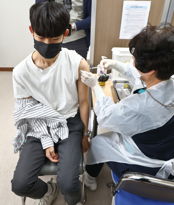 18일 오전 서울 양천구 홍익병원에서 16∼17세 청소년이 코로나19 백신접종을 받고 있다.