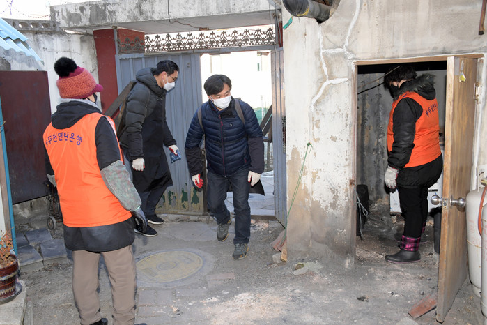 경기 동두천시 기독교연합회는 장로연합회, 경목위원회 Cbmc와 함께 성금 120만원을 모아 18일 중앙동 취약계층 3가구에 연탄 1500장을 직접 배달했다. 사진은 이날 봉사자들이 연탄을 배달하고 있는 모습. (사진제공=동두천시청)