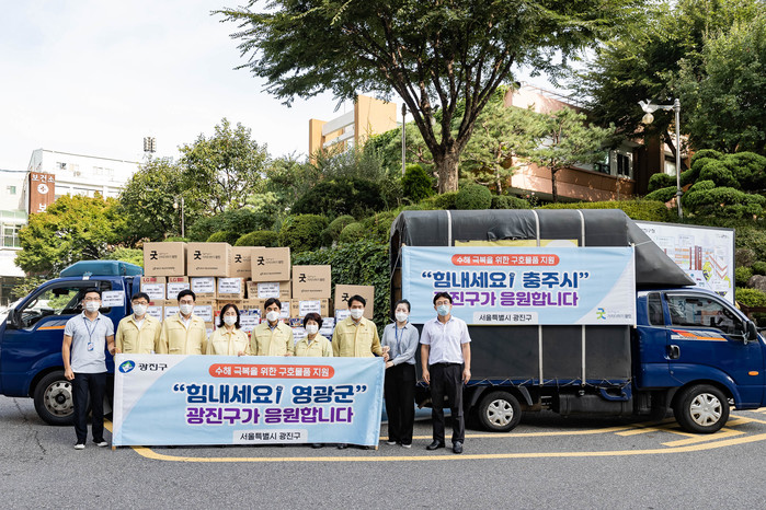 서울 광진구가 최근 집중호우로 피해를 입은 자매도시 전남 영광군과 우호도시 충북 충주시에 지난 25일 긴급 구호물품과 위로 서한문을 전달했다. 구는 해당 도시에 식료품과 생활용품, 덴탈마스크 등 총 1000만원 상당의 물품을 마련했다. 사진은 25일 구호물품 지원차량 앞에서 기념촬영을 하는 구청 직원들의 모습. (사진제공=광진구청)