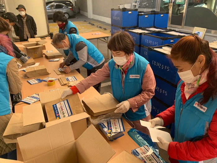 경기 안산시가 5일 지역내 기업 후원으로 안산시자원봉사센터와 함께 경제적 어려움을 겪는 이웃에 김치 10kg 665통과 밑반찬 3종 665세트를 포장해 드라이브 스루 방식으로 전달했다. 사진은 이날 참여한 봉사자들이 김치와 밑반찬을 포장하고 있는 모습. (사진제공=안산시청)