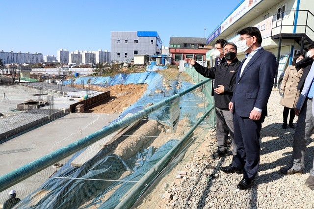 | ▲ 김종효 광주광역시 행정부시장이 12일 오전 광주솔로몬로파크 건립 현장을 방문해 공사 관계자로부터 건립사업 추진사항을 보고 받고 있다./광주광역시 제공 |