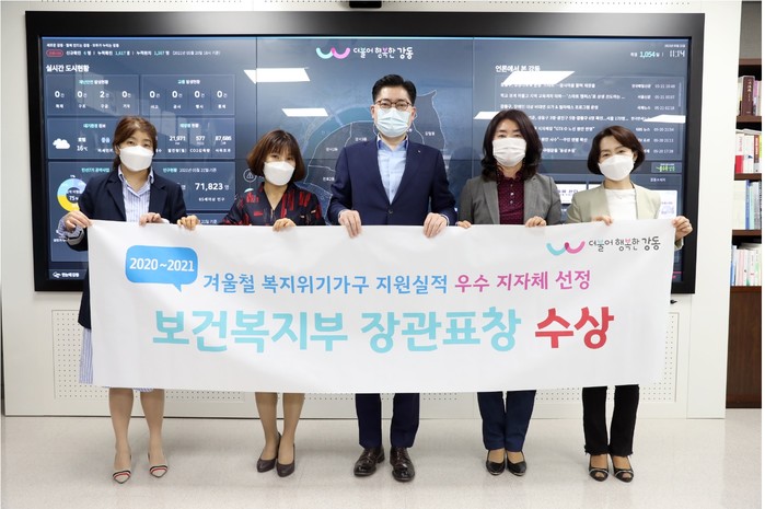 서울 강동구가 최근 보건복지부 주관 ‘겨울철 복지사각지대 발굴 및 지원 평가’에서 지원 실적 우수지자체로 선정돼 장관 표창을 받았다. 구는 겨울철 복지사각지대 발굴 및 지원기간에 위기가구 2283명을 발굴·지원했으며 이는 전년대비 170%가 증가한 것이다. 사진은 이정훈 구청장(가운데)이 표창장을 받은 후 관련 부서 관계자들과 기념촬영을 하는 모습. (사진제공=강동구청)
