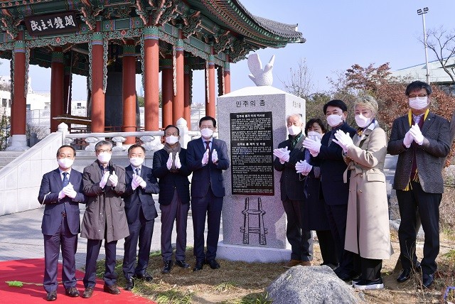 이날 제막된 표지석은 높이 2.35m로, 민주의 종각 터의 역사성과 민주의 종 제작 및 타종의 의미가 한글과 영어, 중국어, 일본어 등 4개 국어로 표기됐다.