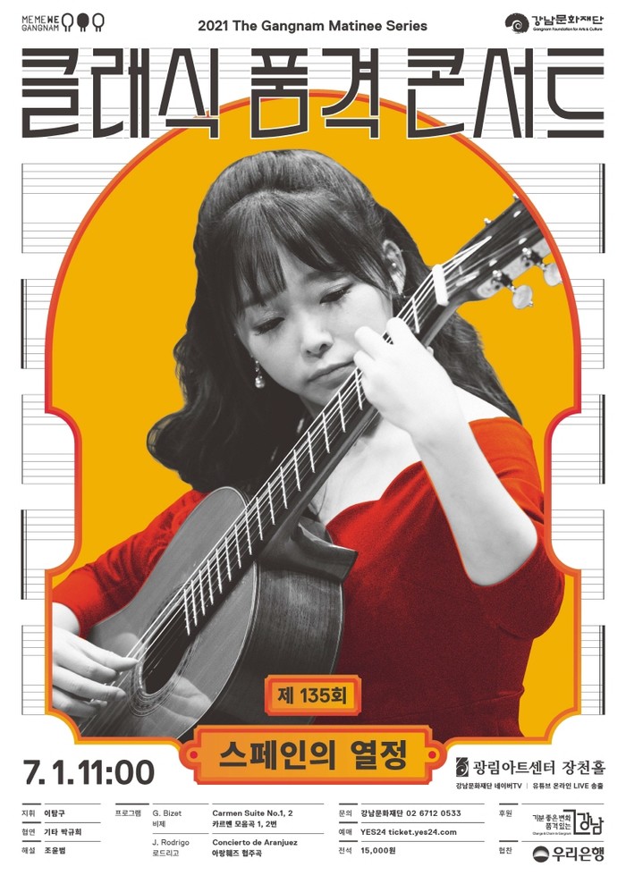 7월 ‘클래식 품격 콘서트’는 이탐구 부지휘자의 지휘아래 강남심포니오케스트라의 연주와 바이올리니스트 조윤범의 해설로 친근함을 더한다. 특히, 세계적 권위의 벨기에 프렝탕 국제 기타 콩쿠르에서 아시아 최초, 여성 최초 1위를 차지한 한국을 대표하는 기타리스트 박규희가 협연자로 함께한다.