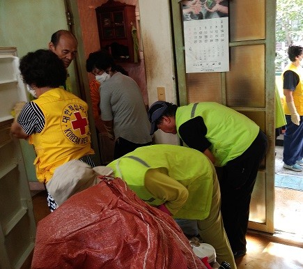 인천 미추홀구 도화 2·3동 지역사회보장협의체는 27일 적십자봉사회와 함께 기초생활수급자 가구를 대상으로 ‘이웃과 함께하는 해피하우스’ 집수리 봉사를 실시, 쓰레기 수거와 물건 정리 등을 했다. 사진은 정리를 하는 모습. (사진제공=미추홀구청)