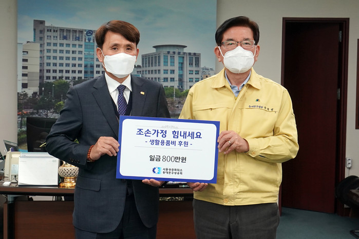 서울 동대문구가 최근 구 상공회로부터 코로나19로 어려움을 겪고 있는 이웃을 위한 성금 800만원을 전달받았다. 이날 기탁식에는 유덕열 구청장을 비롯해 김완진 상공회장 등이 참석했다. 사진은 성금 전달 후 기념촬영하는 유 구청장(오른쪽)과 김 회장의 모습. (사진제공=동대문구청)