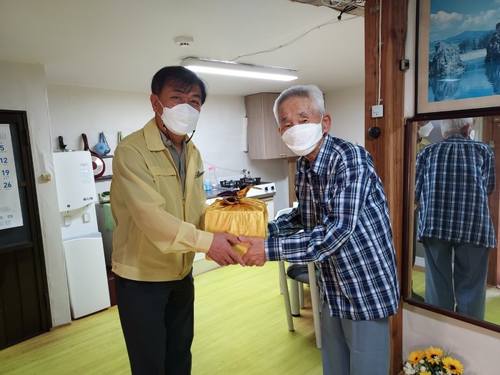 경기 여주시 강천면지역사회보장협의체는 호국보훈의 달을 맞이해 23일 지역내 저소득층 6.25참전 유공자 노인 6가구를 방문해 건강보조식품과 비타민 등을 담아 감사의 선물을 전달했다. 사진은 협의체 관계자가 유공자에게 선물을 전달하고 있는 모습. (사진제공=여주시청)