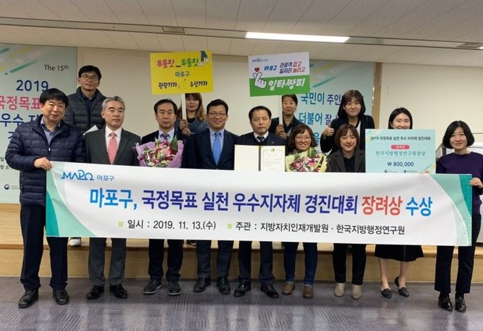 마포구가 13일 열린 '2019 국정목표 실천 우수 지자체 경진대회'에서 '마포특화 관광콘텐츠 개발을 통한 관광활성화 및 지역일자리 창출 사업'으로 장려상을 받았다. 사진은 수상 후 구 직원들이 기념촬영을 하고 있는 모습. (사진제공=마포구청)