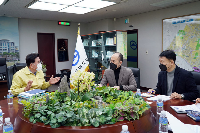 서울 동대문구에 23일 코로나19 지역책임관이 방문해 구의 코로나19 관련 대응현황, 애로사항 등 의견을 청취했다. 구는 지역책임관에게 선별진료소 등 운영현황과 백신접종 준비상황·방역 업무 추진에 따른 애로사항 등을 전달했다. 사진은 이날 유덕열 구청장(왼쪽)이 지역책임관과 대화를 하고 있는 모습. (사진제공=동대문구청)