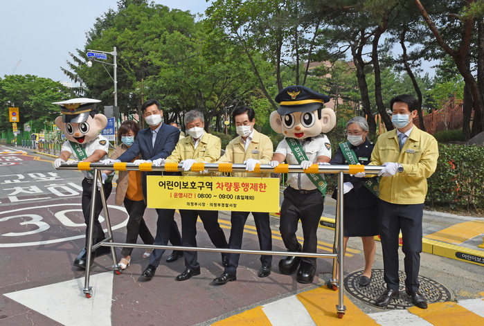 김계조 행정안전부 재난안전관리본부장이 어린이 교통사고 예방을 위해 17일 경기 의정부시 청룡초등학교를 방문, 등하교 시간대 학교 앞 통학로 일정구간에 차량 통행을 제한하고 있다.