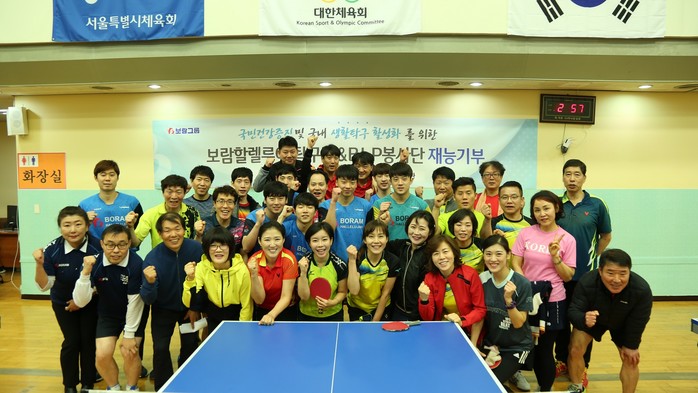 | ▲ 보람상조 스포츠 사회봉사단 B.L.P가 서울 천호동 코리아탁구클럽에 방문해 재능기부 활동 후 기념사진을 촬영하고 있다.(사진제공=보람상조) |