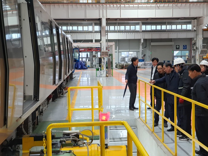 박동익 신임 경기 김포시 교통국장은 7일 김포골드라인 차량기지와 정거장 등을 방문해 시설 점검에 나섰다. 이날 박 국장은 철도시설과 열차관리 상태 등을 점검하고 개선대책을 논의했다. 사진은 박 국장이 관계자들과 시설을 살펴보는 모습. (사진제공=김포시청)