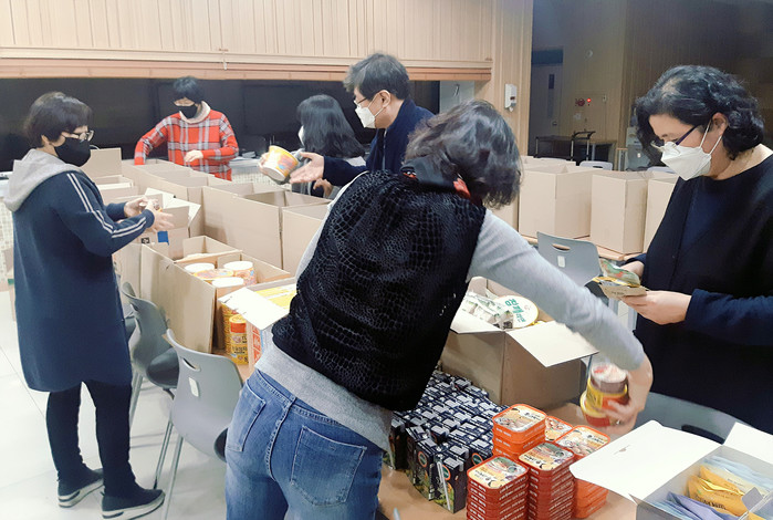 서울 서대문구 북아현동이 최근 지역내 아현중앙교회로부터 코로나19로 어려움을 겪고 있는 주민을 위해 직접 제작한 생필품 키트 20상자를 전달받았다. 전달받은 물품은 지역내 저소득 1인 가구 주민들에게 전달됐다. 사진은 생필품 상자를 포장하는 모습. (사진제공=서대문구청)