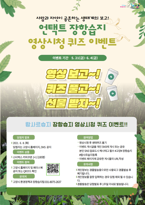 참여 방법은 고양시 홈페이지 또는 페이스북에 접속해 장항습지 영상을 시청한 후 생태퀴즈를 풀고 게시물을 개인 SNS에 공유한 후 공유 URL을 제출하면 된다.