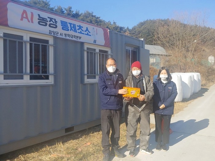 함양군 안의면(면장 전일옥)은 최근 전국 가금농장에서 잇따라 고병원성 AI, 야생멧돼지 아프리카 돼지열병 등이 지속 검출에 따라 17일 관내에 소재하고 있는 조류 인플루엔자(AI) 방역초소 3개소 및 아프리카 돼지열병(ASF) 방역 초소 등 4개소를 방문하여 방역활동에 전력을 다하고 있는 현장 근무자들에게 따뜻한 음료를 제공하며 격려했다.