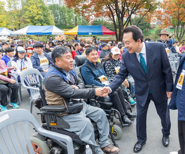 서울 강서구는 23일 허준근린공원 일대에서 장애인 및 장애인 가족 등 600여명이 참여한 가운데 ‘강서구 장애인가족 힐링 걷기대회’를 개최했다. 사진은 대회에 참석한 노현송 구청장(오른쪽)이 주민과 이야기를 나누며 악수를 하는 모습. (사진제공=강서구청)