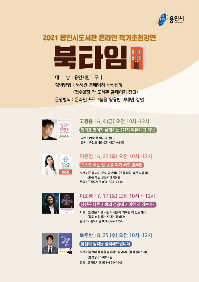 마지막으로 8월 25일에는 ‘당신의 생각을 정리해드립니다’의 저자이자 생각 정리 클래스의 대표인 복주환 작가와 함께 저서 제목과 동명의 주제로 인생을 바꾸는 생각 정리 기술을 알아본다.