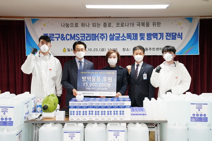 서울 종로구는 지난 23일 창신제1동 주민센터에서 CMS코리아(주)로부터 살균소독제 및 방역소독기(1500만원 상당)를 전달받았다. 창신제1동은 쪽방지역 등 지역내 기초생활수급대상자 등 총 500가구에 후원받은 물품을 지원할 예정이다. 사진은 전달식에서 관계자들이 기념촬영을 하고 있는 모습. (사진제공=종로구청)