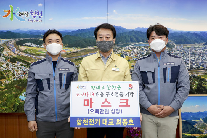 합천전기 최종호 대표는 지난 2일 합천군청을 방문해 코로나19 극복을 위해 사용해 달라며 500만원 상당의 마스크를 기탁했다.