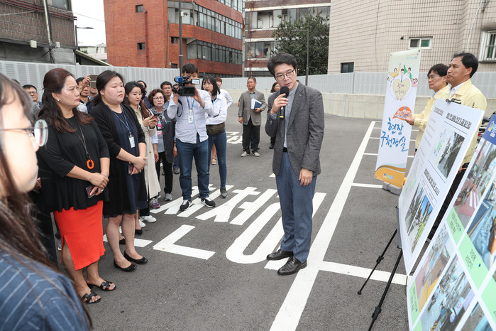 성동구는 최근 동명초등학교 앞 통학로에서 통학에 방해가 되는 전주를 뽑는 작업을 마쳤다. 구는 올해 말까지 위험에 노출된 전신주 40기를 제거 또는 이설할 계획이다. 사진은 정원오 구청장이 전주 제거 사업에 대해 설명하는 모습. (사진제공=성동구청)