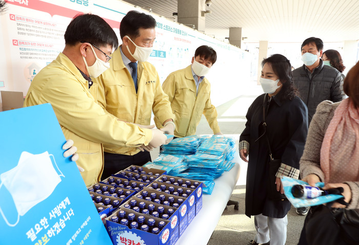 24일 오전 서울 성북구청 정문 앞에서 이승로 구청장이 출근하는 직원들에게 국민 안심 마스크를 나눠주고 있다. 구청 직원들에게 재활용 가능한 면 마스크를 나눠줘 약국 판매 일회용 공적 마스크를 더 필요한 사람이 살 수 있도록 하는 목적이다.