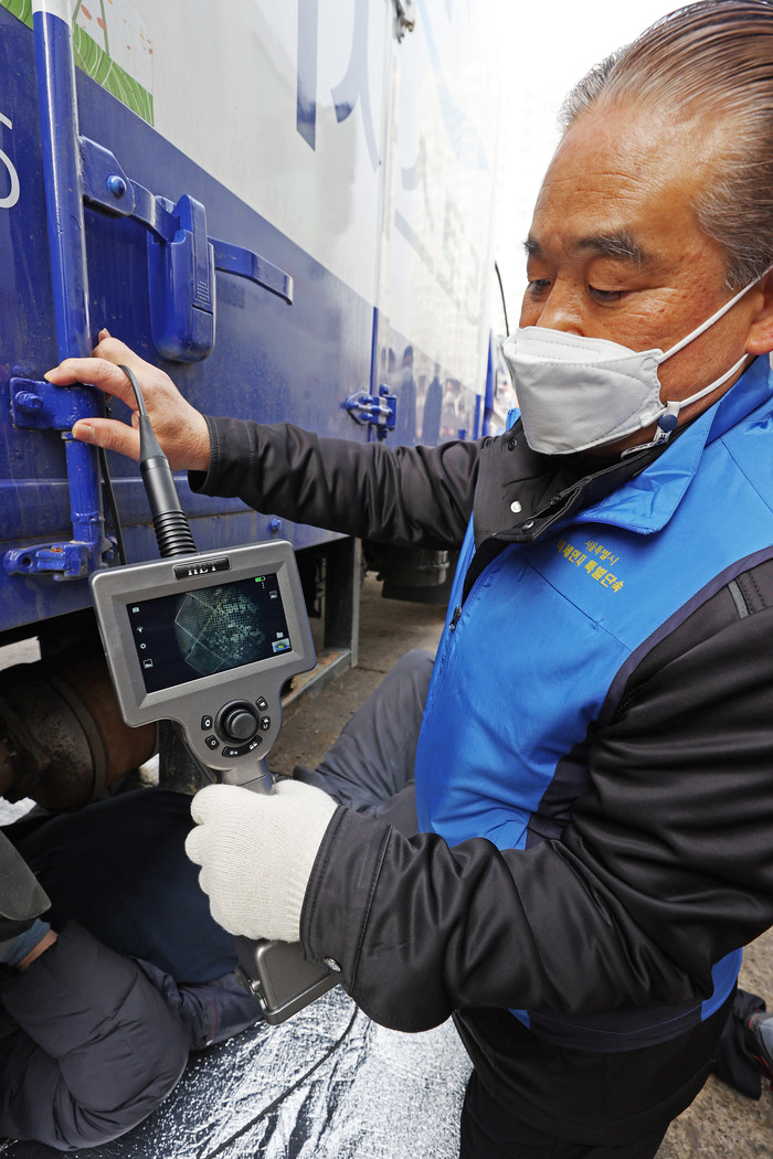 서울시 관계자가 15일 오전 서울 양천구 서부트럭터미널에서 미세먼지 비상저감조치 관련 운행차 배출가스 단속을 하고 있다.