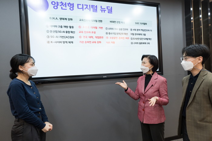서울 양천구는 지난 17일 겨울방학 대학생 행정인턴 근무종료에 따른 간담회를 진행했다. 구는 행정인턴 정책참여단을 운영해 구의 디지털 교육정책 등에 대한 모니터링을 실시하고 논의했다. 사진은 이날 김수영 구청장(가운데)이 행정인턴 정책참여단과 정책제안을 논의하고 있는 모습. (사진제공=양천구청)