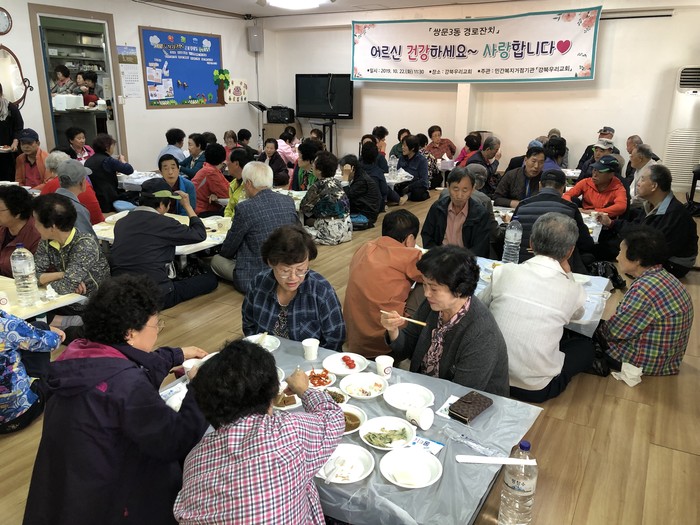 서울 도봉구 쌍문3동은 '경로의 달'을 맞이해 최근 민간복지거점기관인 강북우리교회에서 ‘효사랑 나눔 경로 큰 잔치’를 개최했다. 이날 지역내 노인을 위해 정성스레 마련한 음식을 대접하며 담소를 나눴다. 사진은 노인들이 식사를 하는 모습. (사진제공=도봉구청)