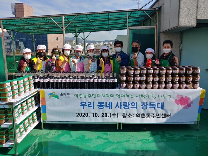 서울 은평구 역촌동주민자치회는 2020년 주민세 환원 사업으로 선정된 '우리동네 사랑의 장독대'로 최근 직접 담근 된장(1kg)과 간장(750ml)을 홀몸노인 등 취약계층 70가구에 전달했다. 사진은 행사 현장에서 기념촬영을 하고 있는 모습. (사진제공=은평구청)