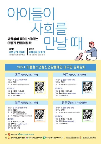 광주시와 대한소아청소년정신의학회가 주최하고 광주광역정신건강복지센터, 동·남·북·광산구 정신건강복지센터가 주관하는 이번 강좌는 ‘사회성이 뛰어난 아이는 어떻게 만들어질까’라는 주제로 17일부터 7월21일까지 총 4회 열린다. 6월17일을 제외한 강좌는 온라인으로 실시한다.