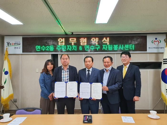 인천 연수구 연수2동주민자치회가 최근 구 자원봉사센터와 자원봉사 활동에 대한 업무 협약을 맺고 동을 거점으로 하는 지역사회 맞춤형 자원봉사 모델 개발과 자원봉사를 통한 지역공동체 회복에 힘을 모으기로 했다. 사진은 협약 체결 후 관계자들이 기념촬영하는 모습. (사진제공=연수구청)