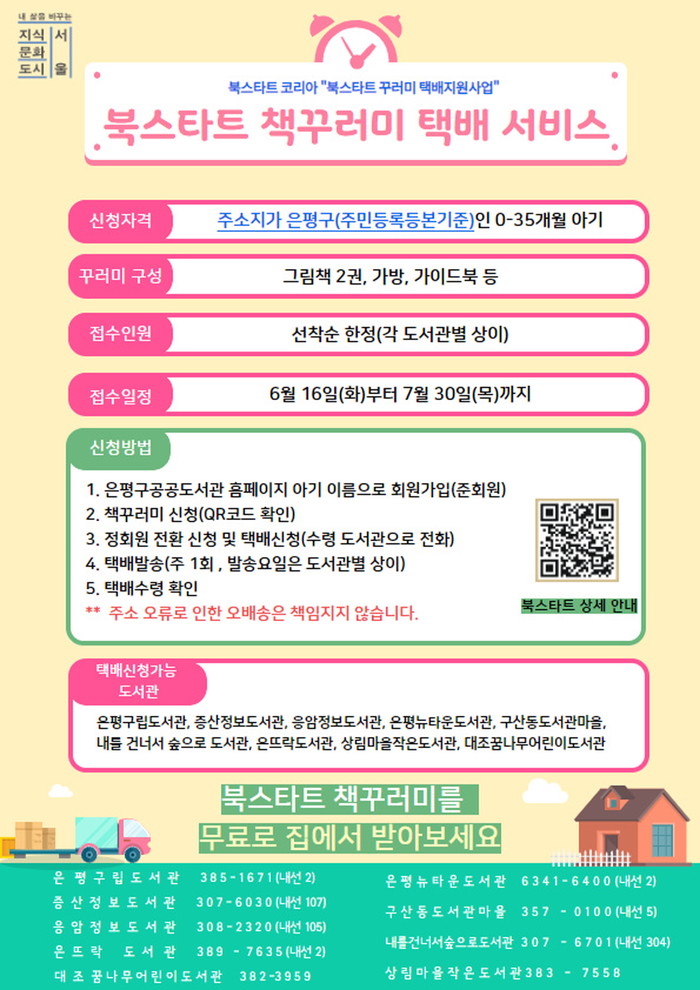 [시민일보 = 이대우 기자] 서울 은평구 공공· 작은도서관은 '북스타트 책꾸러미 택배 서비스'를 오는 7월30일까지 실시한다.