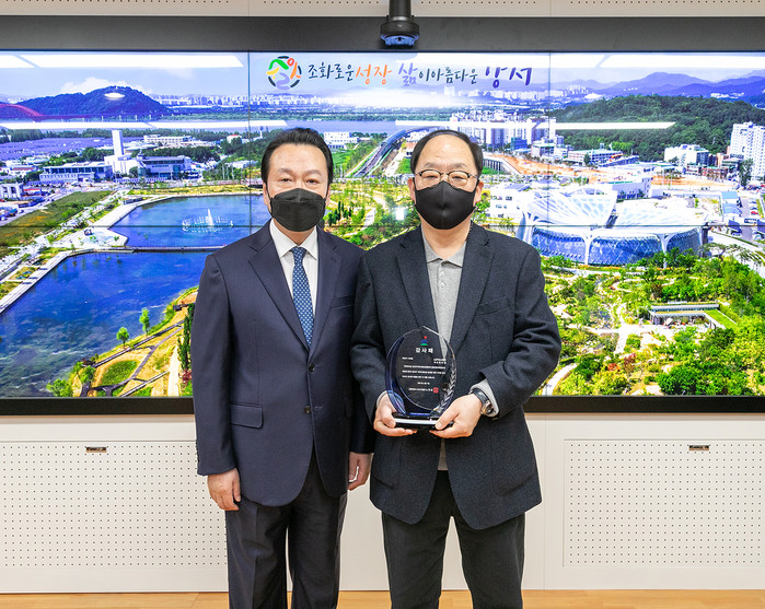 노현송 강서구청장은 지난 16일 위기가정 등 어려운 이웃을 발굴하며 지역사회 복지 증진을 위해 힘써온 지역사회보장협의체에 감사패를 전달했다. 사진은 노 구청장(왼쪽)이 권오섭 강서구지역사회보장협의체 민간위원장에게 감사패를 전달하고 기념촬영을 하고 있는 모습. (사진제공=강서구청)