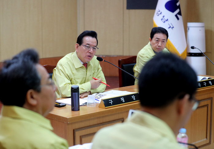 정순균 서울 강남구청장이 17일 구청 4층 회의실에서 코로나바19(우한폐렴) 대책회의를 열고, 부서별로 추진하고 있는 코로나19의 관리 현황 및 대응계획 등을 논의했다. 사진은 회의를 진행하고 있는 정 구청장의 모습. (사진제공=강남구청)
