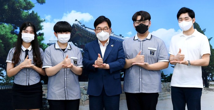 경기 광주시 태전고등학교 학생들이 최근 시청을 방문해 신동헌 시장을 만나 코로나19를 막기 위해 고군분투 하는 의료진들을 위한 감사의 편지와 배지를 전달하고 ‘덕분에 챌린지’에 동참했다. 사진은 신 시장(가운데)과 학생들이 챌린지 포즈를 취하는 모습. (사진제공=광주시청)