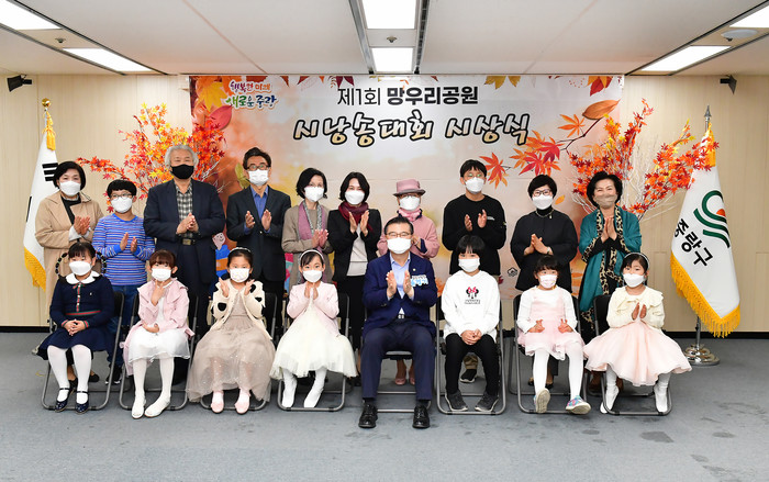 서울 중랑구가 지난 19일 '제1회 망우리공원 시낭송대회 시상식'을 개최했다. 이 대회는 망우리공원에 잠들어 있는 근현대사 주요인물과 관련된 시 또는 자작시를 주제로 지난 9월 시낭송 동영상을 접수받았다. 사진은 시상식에서 류경기 구청장(앞줄 가운데)이 수상자들과 기념촬영을 하는 모습. (사진제공=중랑구청)