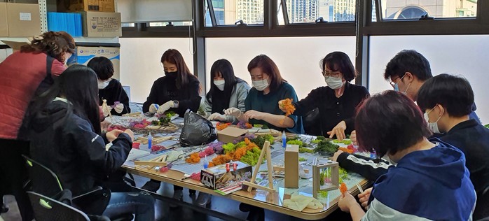경기 수원시 영통구 영통3동은 지난 24일 노인들을 위한 스칸디나비아모스 화분 제작 및 자율방역을 통한 거리정화 봉사활동을 진행했다. 이날 영통3동 청소년 가족 봉사단과 주민자치위원회는 코로나19로 인해 장기간 운영이 중단됐던 지역내 경로당 13개곳에 전달하기 위해 손쉽게 기를 수 있는 공기정화식물인 스칸디나비아모스 화분을 제작했다. 사진은 참여자들이 화분을 만들고 있는 모습. (사진제공=영통구청)