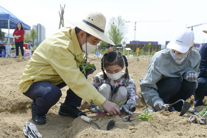 경기 포천시농업기술센터가 지난 24일 '소확행 시민텃밭'을 개장했다. 이날 개장식은 박윤국 시장을 비롯해 텃밭을 분양 받은 시민 가족 대표자 24명이 참석한 가운데 도시농부 선서를 시작으로 모종 전달식, 옥수수 모종심기, 기념촬영 등으로 진행됐다. 사진은 이날 행사에 참석한 박 시장(왼쪽)이 시민들과 옷수수 모종을 심고 있는 모습. (사진제공=포천농업기술센터)