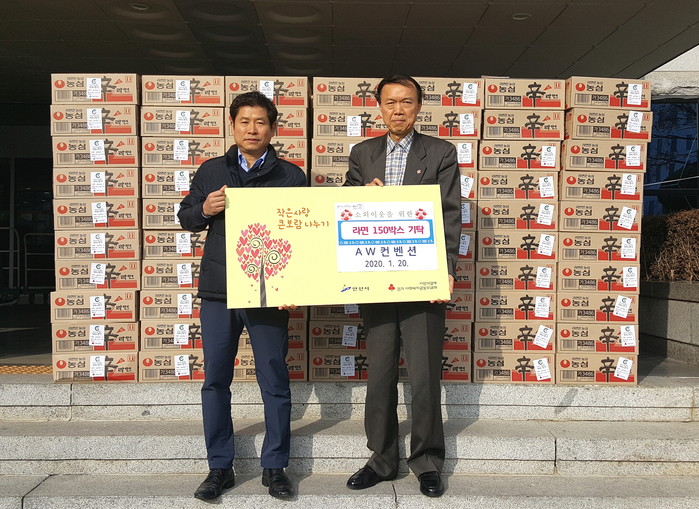 경기 안산시는 설 명절을 앞두고 20일 AW컨벤션으로부터 지역내 저소득계층 가구를 위한 '사랑의 라면' 150상자를 기탁받았다. 라면은 경기사회복지공동모금회를 통해 전달될 예정이다. 사진은 관계자들이 기념촬영을 하는 모습. (사진제공=안산시청)