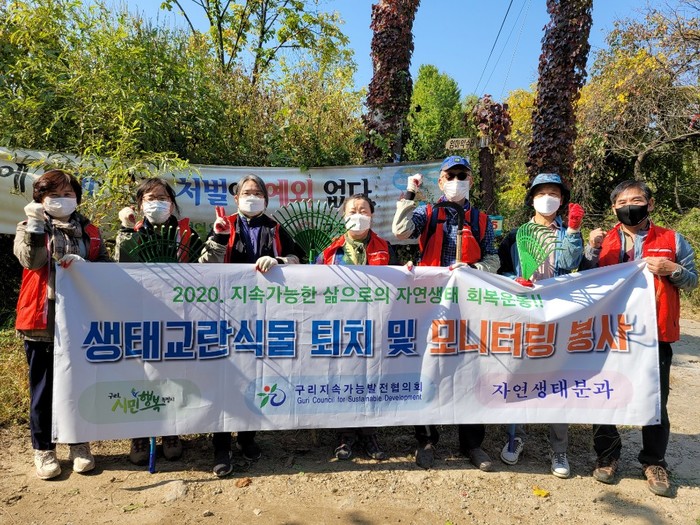 경기 구리시는 지난 19일 교문동 아차산 원불교 부근에서 구리지속가능발전협의회 주관으로 생태 교란 식물 제거 작업을 추진했다. 이 사업은 생태교란 식물의 유입으로 인해 생물다양성 감소 및 생태계 교란 등의 피해가 증가함에 따라 생태계 균형을 유지하기 위해 실시됐다. 사진은 이날 참가자들이 기념촬영을 하고 있는 모습. (사진제공=구리시청)