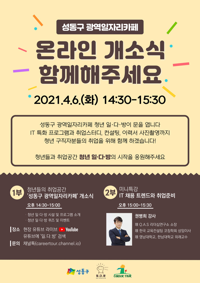 [시민일보 = 홍덕표 기자] 서울 성동구(구청장 정원오)는 6일 당일 온라인 라이브 진행과 함께 성동안심상가에 서울시 동북권 광역일자리카페 1호점 ‘청년 일·다·방’을 개소한다.