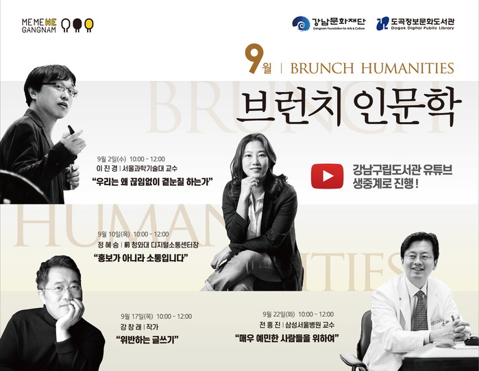 브런치 인문학은 9월 한 달 간 4번의 강연을 오전 10시부터 온라인 생중계로 진행하며 강남문화재단 홈페이지와 강남구립도서관 유튜브로 누구나 시청 할 수 있다. 자세한 문의는 도곡정보문화도서관에 문의하면 된다.
