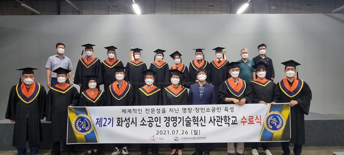 경기 화성시 소공인 경영기술혁신 사관학교가 26일 수료식을 개최했다. 교육은 지난 6월부터 8주간 ▲4차 산업혁명과 제조업 대응 방안 ▲스마트폰 활용 ▲드론 등을 주제로 진행됐다. 사진은 수료식에서 수료생들이 기념촬영을 하는 모습. (사진제공=화성시청)